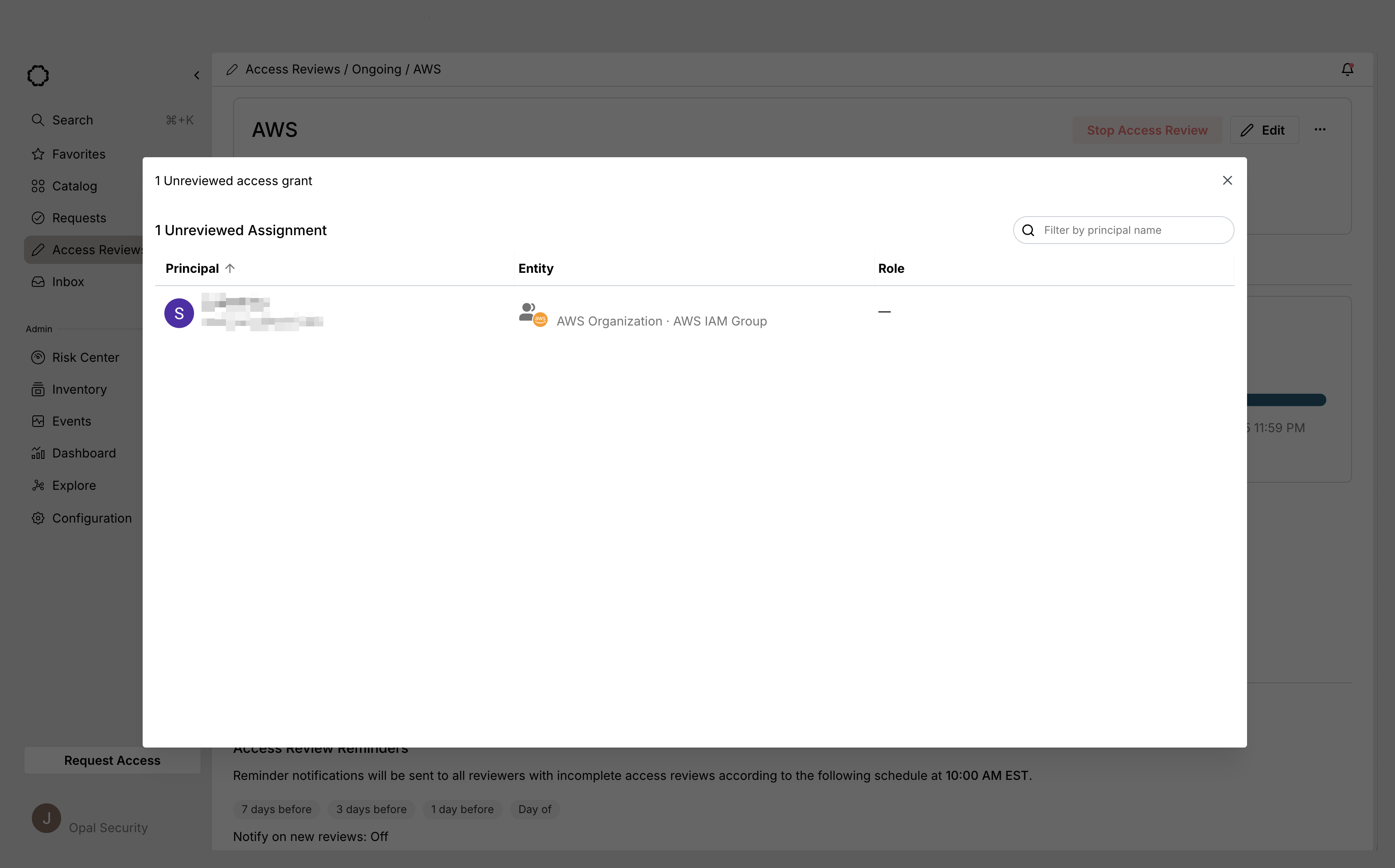 Opal Auditors can select Stop Access Review in the Overview tab to stop the Access Review.