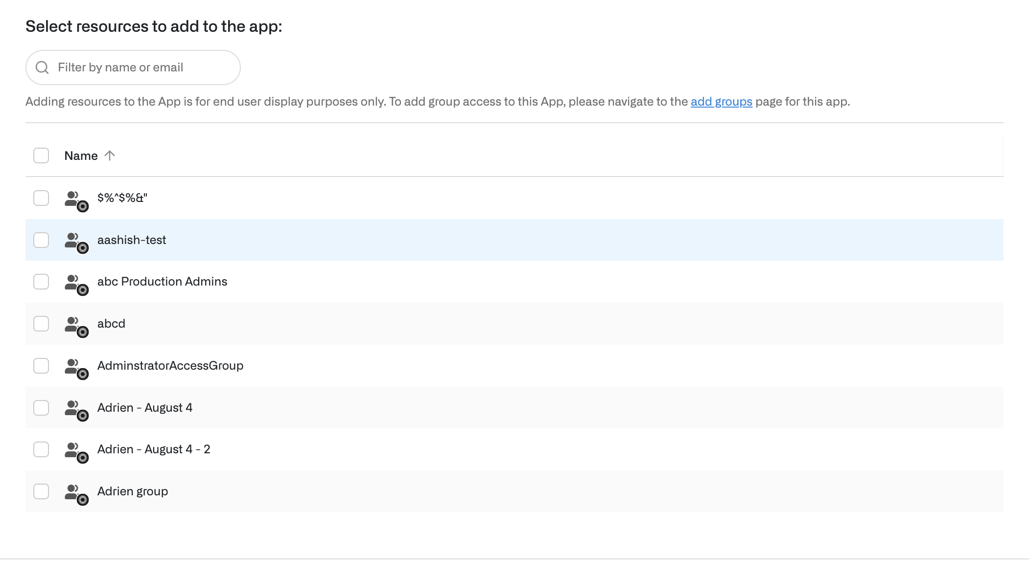 You may want to create groups in Opal which do not have access relationships in your IDP. For example, Okta push groups may need to be requested by end users to associate the group and app, but the group should not have direct access to Okta apps. For these cases, you can add groups as resources from the app’s Inventory page by selecting Add Resources.